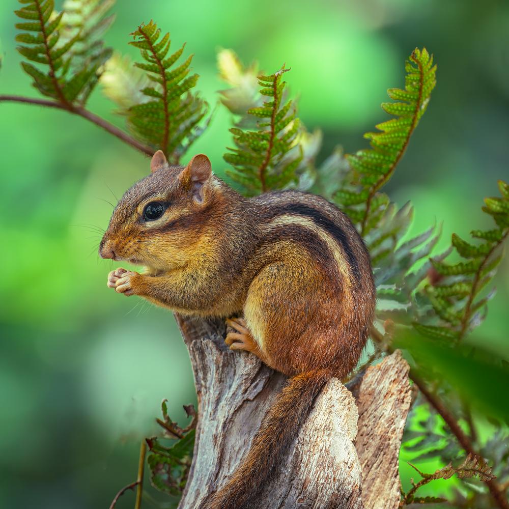 A chipmunk relaxes on an aged stump beneath the curls of an elegant fern.