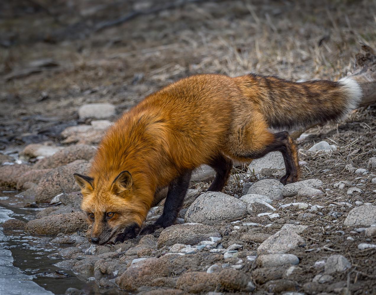 Winter is ending, and the river is beginning to thaw. A curios red fox approaches the edge, searching for his next meal.