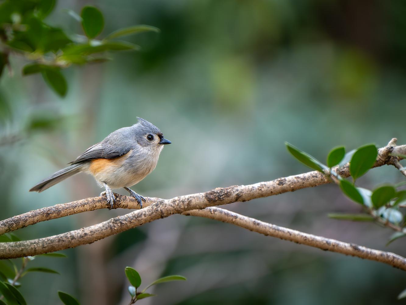 A tufted titmouse bird perches alone on a branch.